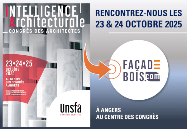 Les 23 et 24 octobre 2025 au Congrès des Architectes à Angers, FAÇADEBOIS.COM sera présent aux côtés de ses partenaires FUNDERMAX, LUNAWOOD et MAUGY. Cet événement unique rassemble chaque année les acteurs majeurs de l’architecture pour réfléchir aux enjeux de demain et découvrir les solutions innovantes qui transforment le secteur.