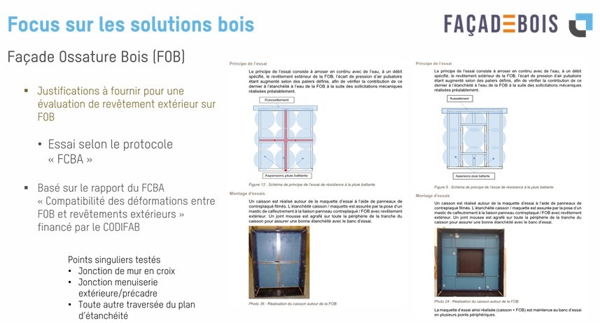 Les travaux du CODIFAB et du Club des industriels ont permis de recenser le peu d’offres disponibles en matière de revêtement sur FOB. De même, si le DTU 31.4, datant de mai 2020, définit cette façade ossature bois, le revêtement et sa mise en œuvre requièrent une évaluation spécifique.