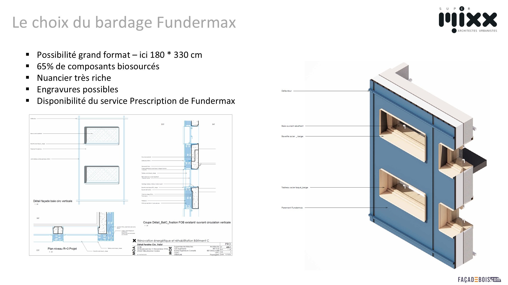 L’avis de chantier est considéré toutefois comme une solution de technique non courante, un point susceptible de soulever des interrogations du côté des assureurs. Cet avis de chantier a néanmoins constitué une première étape déterminante vers l’obtention d’une ATEx, portée par FUNDERMAX, permettant aujourd’hui de considérer la solution comme une technique courante.