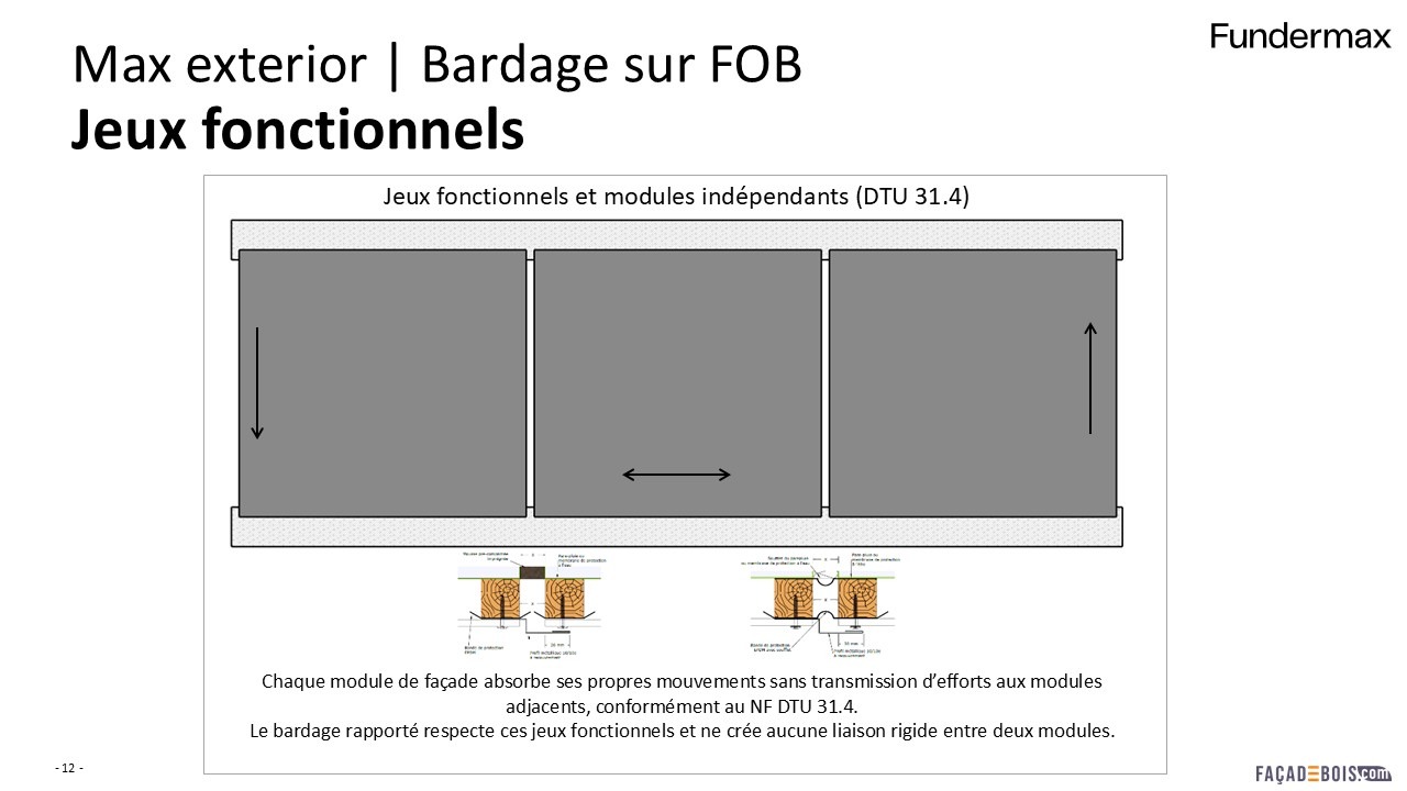 Les travaux du CODIFAB et du Club des industriels ont permis de recenser le peu d’offres disponibles en matière de revêtement sur FOB. De même, si le DTU 31.4, datant de mai 2020, définit cette façade ossature bois, le revêtement et sa mise en œuvre requièrent une évaluation spécifique.